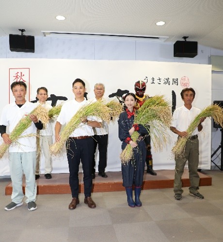 秋田県の鈴木健太知事は25日、デビュー4年目を迎える県ブランド米「サキホコレ」の出来映え報告会を大仙市で行いました。今年の作柄について、JA秋田おばこサキホコレ生産専門部会員でマイスターの齊藤亘さんは「天候不順もあったが丁寧に管理し、高品質に実った。全国の皆さんに味わってほしい」と報告。知事が5月に田植えを行った「サキホコレ」を使った新米おにぎりをイメージキャラクターの壇蜜さんと一緒に試食し、知事は「一粒一粒がしっかりして美味しい」と笑顔を見せました。